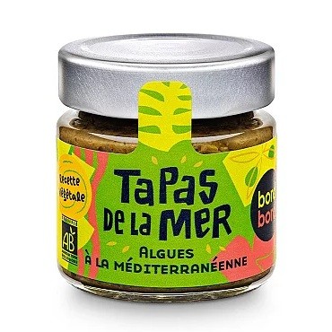 Ingrédients : Algues 30 % (spaghetti de mer, dulse, laitue de mer* et wakamé, origine Bretagne ou *Portugal), huile d’olive vierge extra, cornichon et câpre au vinaigre, oignon, échalote, basilic, origan, ail, romarin, thym.